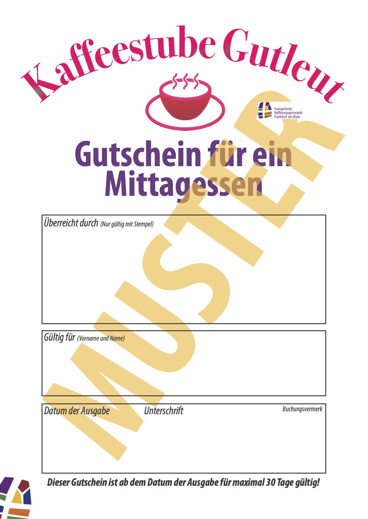 Diese Gutscheine sind eine gute Möglichkeit für Sie, bedürftige Menschen in Ihrer Gemeinde vor Ort zu unterstützen, ohne Bargeld auszugeben. Und mit dem Beitrag für die Kaffeestube helfen Sie uns, den Betrieb der Kaffeestube zu halten.
